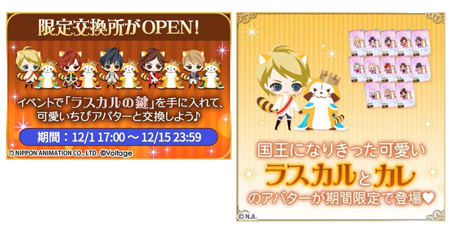 コラボ限定の交換所がオープンいたします。アプリ内で開催中のイベントにて手に入るアイテム「ラスカルの鍵」を集めると、国王になりきったラスカルとカレの限定ちびアバターが手に入ります。このチャンスをお見逃しなく!