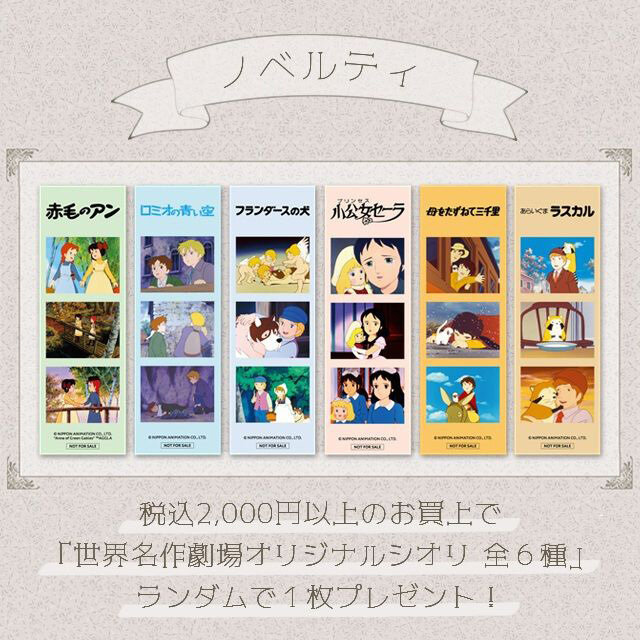税込2,000円以上のお買上で「世界名作劇場オリジナルシオリ 全6種」をランダムで1枚プレゼント 一会計一枚、無くなり次第終了となります。